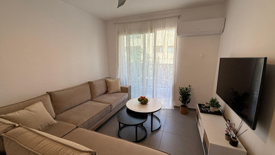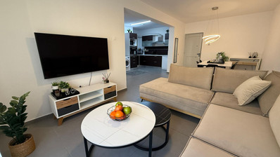 An elegant open-plan living area, tastefully furnished, seamlessly flows into a fully equipped kitchen — ideal for both relaxing and entertaining.